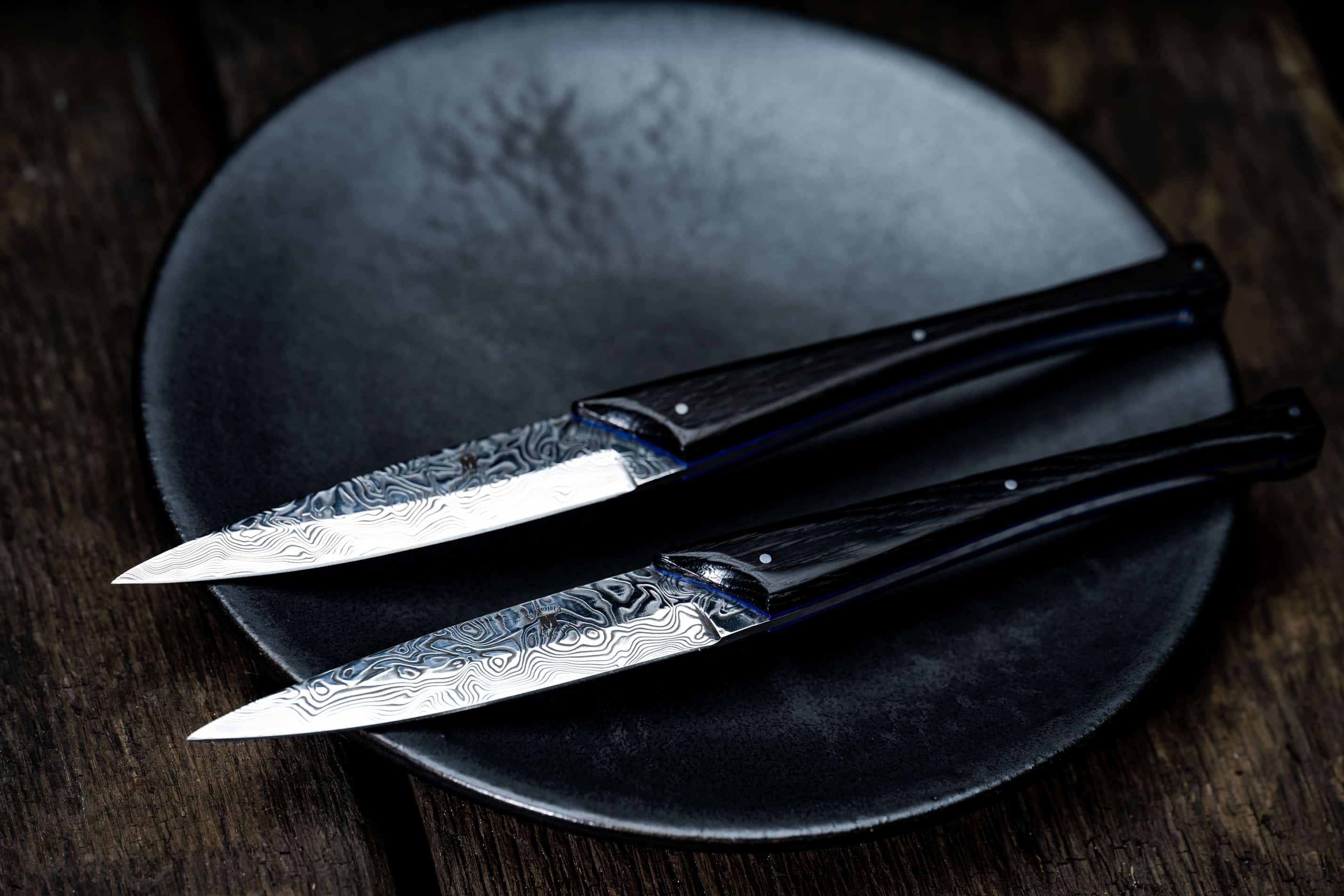 These Damascus steel table knives are adorned with a subtle blue trim in vulcanised fibre, adding a touch of modernity to a decidedly high-end and timeless object. Vulcanised fibre is a composite material made from cotton fibres (sometimes cellulose fibres) that durably withstands temperature variations and has particularly high mechanical resistance. The blade, made from N690 steel and DE 45ncd16 folded over 120 layers, offers a hardness of 61 HRC. Sharpening is easy with a honing steel or a natural whetstone.